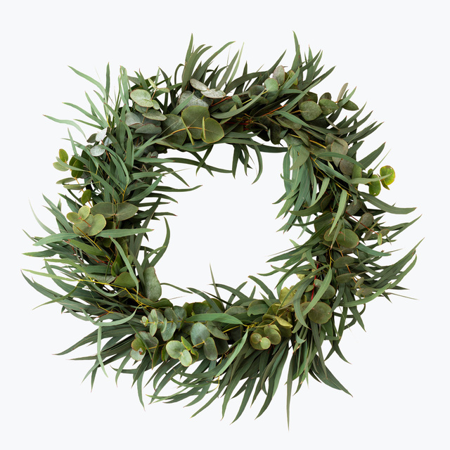 En vakker krans bundet med årstidens trendy, grågrønne eucalyptus-sorter. Perfekt for å pryde døren eller legges på et fat på bordet. Om du ønsker å sende en annerledes hilsen på døra som vil glede lenge, send en vårkrans.